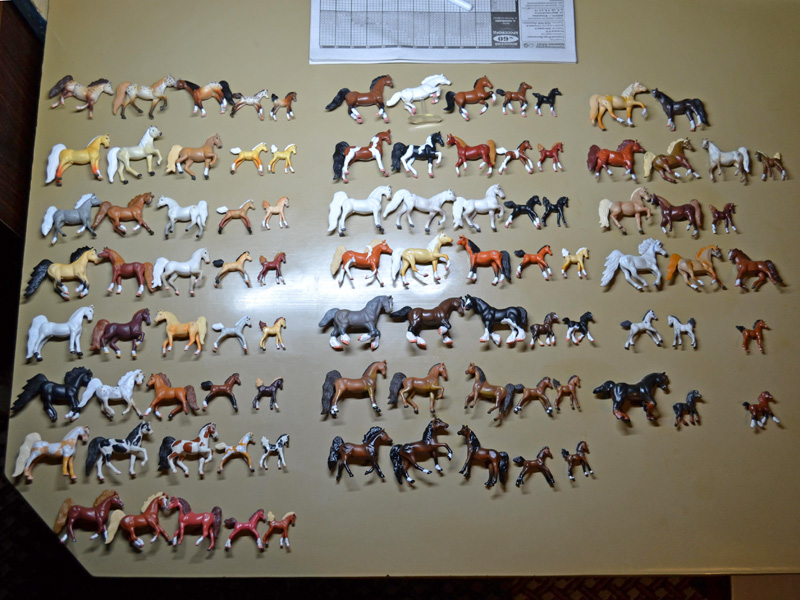 История с конями продолжается. Скооперировались с подругой на еще одну закупку, разобрали, кому чего не хватало, дубли продали дальше другому коллекционеру. Всего у меня теперь 15 полных наборов из 24, еще 8 неполных и одного нет вообще. Не хватает до полной коллекции 27 штук. В целом, я пока удовлетворена, так как получила те два набора, которые очень хотелось. Дальше без фанатизма. Если подвернутся те коняшки, которых у меня нет, по выгодной цене и когда позволяют финансы - возьму, нет - переживу.